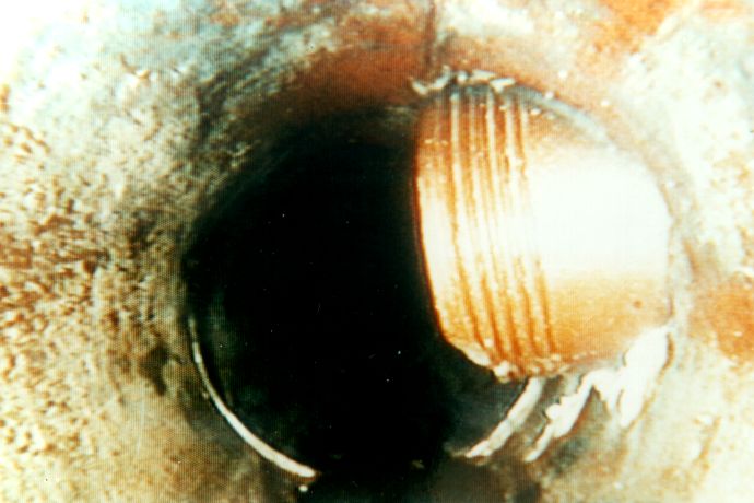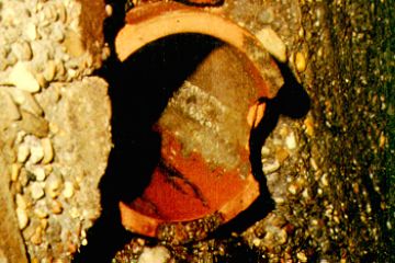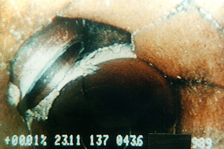 - Einbindung von Anschlußkanälen durch Aufstemmen des Kanales. Insbesondere im nichtbegehbaren, früher kaum kontrollierbaren Nennweitenbereich, wurden viele Anschlußkanäle an den zuvor aufgestemmten Kanal angeschlossen. Bei dieser Vorgehensweise ist es nicht möglich, eine dauerhafte, wasserdichte und gelenkige Verbindung herzustellen. Zusätzlich besteht die Gefahr, daß das Kanalrohr selbst unkontrolliert beschädigt wird (Bild 2.2.2.1.3.2-1) (Bild 2.2.2.1.3.2-2) (Bild 2.2.2.1.3.2-3) (Bild 2.2.2.1.3.2-4) (Bild 2.2.2.1.3.2-5) (Bild 2.2.2.1.3.2-6).