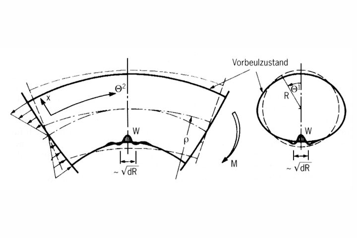 Im Zustand der Vorbeulverformung tritt zusätzlich eine nicht zu vernachlässigende Verformung des Rohrquerschnittes (Ovalisierung) in Verbindung mit der elastischen Verkrümmung auf. Diese nichtlineare Biegung von Rohren - das sog. Brazier-Problem [Brazi27] - wurde in der Vergangenheit meist ohne Bezug zur Beulstabilität betrachtet [Reiss59] [Wood58] .