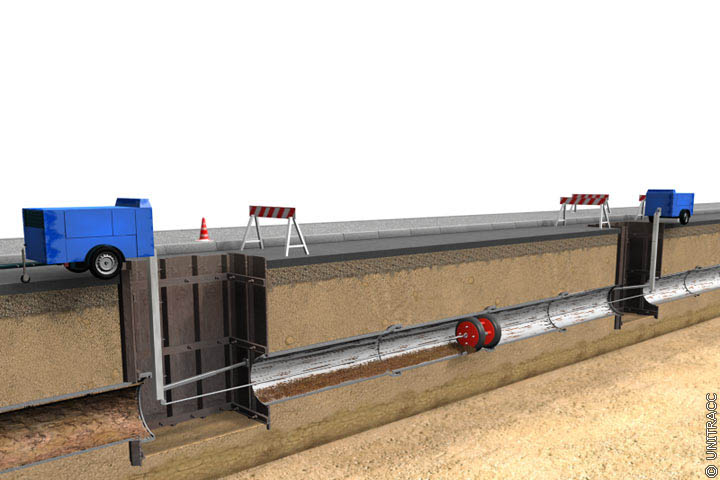 Blick in die Startbaugrube mit aufgeschnittenem Stahlrohr und Stahlfedermolch [FI-Teerb] |