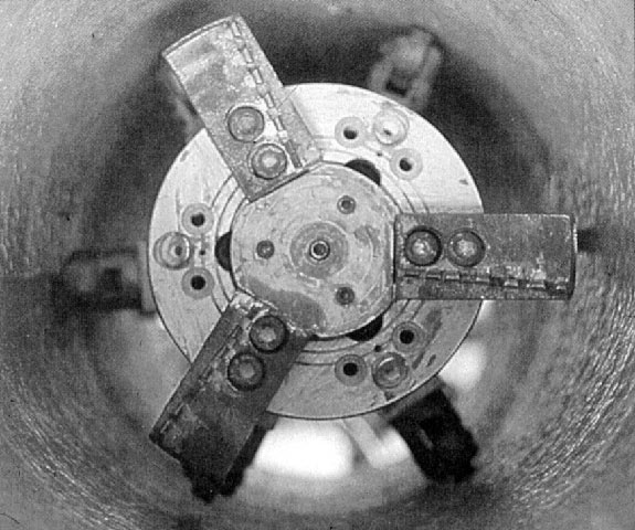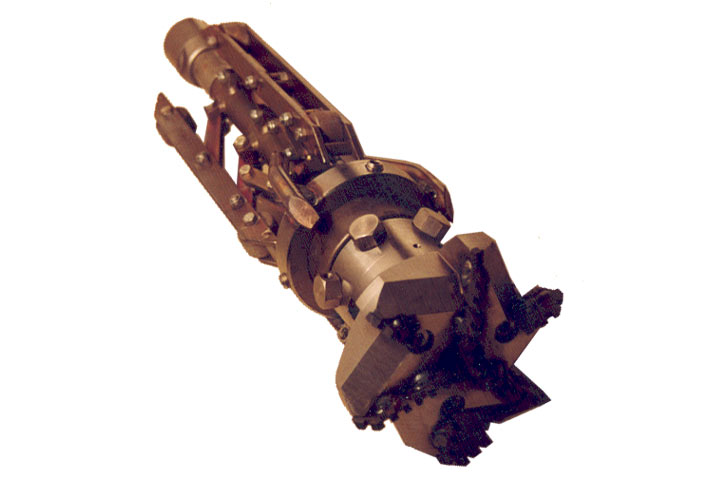 Diese Geräte werden ferngesteuert und i.a. unter Kamerabeobachtung im Nennweitenbereich DN 200 bis DN 600 zur Entfernung fester Ablagerungen (Bild 3.2.4.3.2-1) (Bild 3.2.4.3.2-2) (Bild 3.2.4.3.2-3) (Bild 3.2.4.3.2-4) , einragender Anschlußkanäle (Bild 3.2.4.3.2-5) (Bild 3.2.4.3.2-6) und anderer Abflußhindernisse sowie von Wurzeln (Animation 3.2.4.3.2-1) (Bild 3.2.4.3.2-7) eingesetzt. Der Antrieb erfolgt hydrodynamisch oder ölhydraulisch. Um eine rohrschonende Bearbeitung zu gewährleisten, sind sie zentrisch geführt und in Einzelfällen auch mit stufenlos verstellbaren Fräsköpfen ausgerüstet (Bild 3.2.4.3.2-8) .
