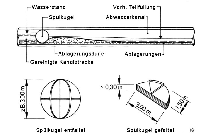 Beseitigung von Ablagerungen in großen kreisförmigen Abwasserkanälen mit Hilfe einer faltbaren Spülkugel [Biele79a] |