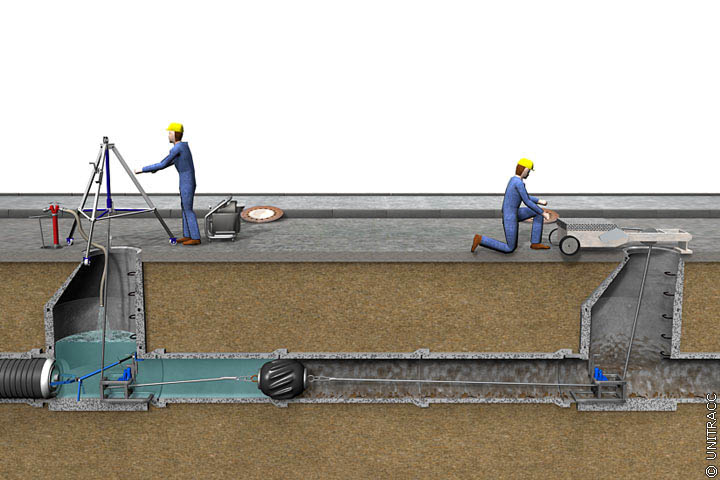 Bei diesem Verfahren werden Geräte in den Kanal eingebracht, die den Querschnitt reduzieren und das Abwasser aufstauen. Durch diesen Aufstau, d.h. durch die Wasserspiegeldifferenz vor und hinter den Geräten, werden sie vorwärtsbewegt und umspült, wobei die nichtverfestigten Ablagerungen aufgelockert und weitertransportiert werden [Führb80] .