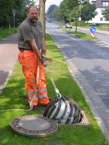 Das Einbringen der Kugeln in den Kanal erfolgt zeitlich definiert und in der Regel manuell über den Schacht (Bild 3.2.2.2-5), es kann aber auch, wie in der (Animation 3.2.2.2-1) dargestellt, automatisiert werden. Die Kugel wird regelmäßig einmal pro Tag bzw. 1-5 mal pro Woche in den Kanal eingegeben, rollt, von der Abwasserströmung angetrieben, stromab durch den Kanal und wird in der Nähe des Klärwerks entnommen, um erneut dem Kreislauf wieder zugeführt zu werden.